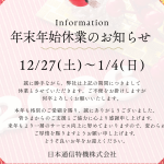 - 本年の年末年始の営業についていつも日本通信特機株式会社をご愛顧いただき、誠にありがとうございます。 本年の最終営業日は 12月26日(金)… 続きを読む: 本年の年末年始の営業について