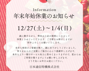 いつも日本通信特機株式会社をご愛顧いただき、誠にありがとうございます。 本年の最終営業日は 12月26日(金) となっております。誠に勝手ながら、12月27日(土)から1月4日(日)までの期間は年末年始休業とさせていただ […]